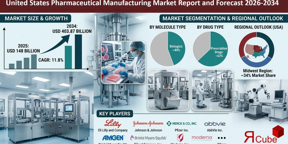 According to recent research report by The Report Cube, the size of United States Pharmaceutical Manufacturing Market was nearly USD 148 Billion in 2025, and by 2034 it is expected to reach around USD 403.87 Billion with a CAGR of 11.8% over the forecast period (2026-2034).